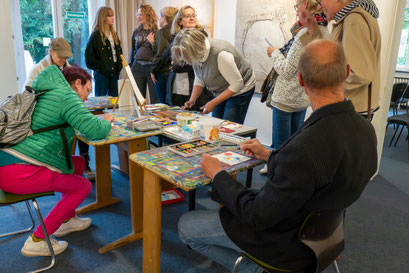 Andrea de Ruiter überraschte das Publikum mit einem kreativen Mitmach-Angebot: Die Gäste konnten selbst aktiv werden und eine individuelle Erinnerung an die Ausstellung gestalten, die sie als